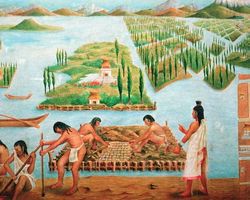Een andere landbouw methode was het bouwen van Chinampa’s. Dat zijn een soort kleine eilanden in een moeras of aan de oever van een meer waar gewassen op werden verbouwd. Het bouwen van een Chinampa ging zo: De boer zette een rechthoekig veld af van ca. 30 meter lang en 2.5 meter breed, dan bouwde hij er een hek omheen van stenen, modder of vegetatie. Zo konden er twee naast elkaar gebouwd worden tussen twee kanalen met een voetpad in het midden. Boeren plantten wilgen aan de rand van een veld. De wortels groeiden in de meerbedding en verstevigden de wanden. De velden bestonden uit laagjes vruchtbaar sediment, dat uit de rivierbedding was gebaggerd. De boeren ploegden de grond om met handgereedschap en plantten zaadjes in de gaten die ze maakten met de zaaistok. Om de aarde vruchtbaar te maken gebruikten ze menselijke uitwerpselen die vanaf de stad in een kano via de kanalen vervoerd werden.