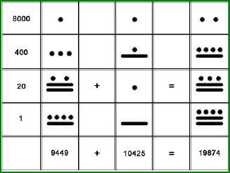 De Maya’s losten dit probleem heel simpel op, namelijk door een getal boven de 20 te zetten, namelijk 400. Nu krijg je dus 3 rijen boven elkaar, waarbij het bovenste getal het aantal maal 400 voorstelt, het middelste getal het aantal maal 20, en het onderste getal wederom de rest. Ook aan deze notering zit een einde, namelijk (19 x 400) + (19 x 20) + 19 = 7999.