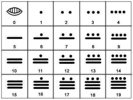 Dit zijn de getallen 0 tot en met 19 in het Mayastelsel: